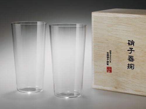 These remarkably thin drinking glasses called “Usu-hari” (thin glass) are each carefully hand blown and crafted by master craftsmen in the Sumida district in downtown Tokyo. They are created using the same techniques that was traditionally used for hand-making glass light bulbs. Less than 1mm thick, the feel of it in your hands, the sound ice makes when it is swirled in the glass, and fineness of the rim is truly exquisite—and unique to this glass.